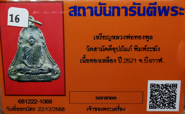 เหรียญหลวงพ่อทองพูล วัดสามัคคีอุปถัมภ์ พิมพ์ระฆัง เนื้อทองเหลือง ห่วงเดิม ปี2521 จ.บึงกาฬ + บัตรG-pra สภาพสวยเดิมค่ะ