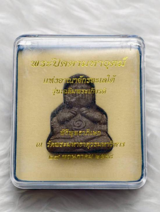 เคาะเดียวแดง พระปิดตามหาอุตม์ แห่งอาณาจักรทะเลใต้ รุ่นเฉลิมพระเกียรติ ปี2548 จัดสร้างโดยวัดมหาธาตุวรมหาวิหาร จังหวัดนครศรีธรรมราช เนื้อผงใบลาน ใต้ฐานบรรจุตะกรุดเงินคู่ ตอกโค้ด และยิงเลเซอร์หมายเลข 574