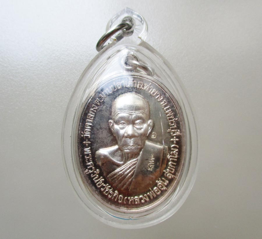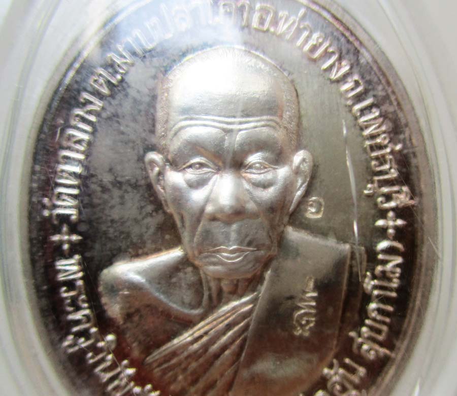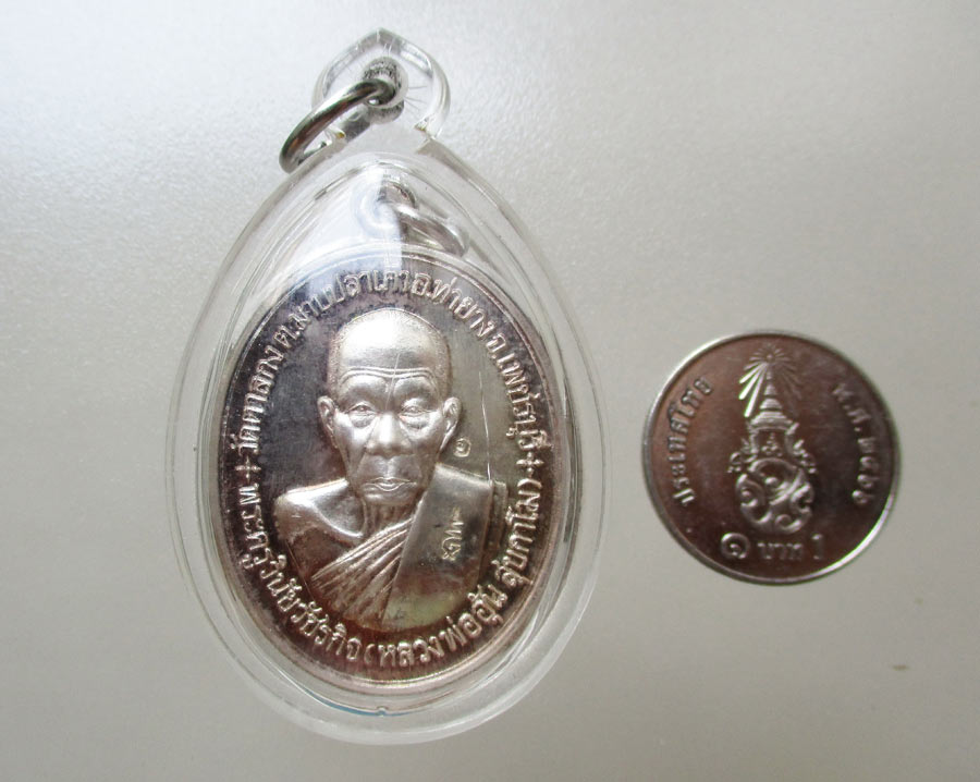 เหรียญหลวงพ่ออุ้น วัดตาลกง จ.เพชรบุรี รุ่นที่ระลึกสร้างกุฎีสงฆ์ พ.ศ.2548 เนื้อเงินผิวกระจก ตอก 4 โค๊ต ตอกเลข สภาพสวย เลี่ยมกันน้ำพร้อมแขวน !!