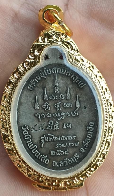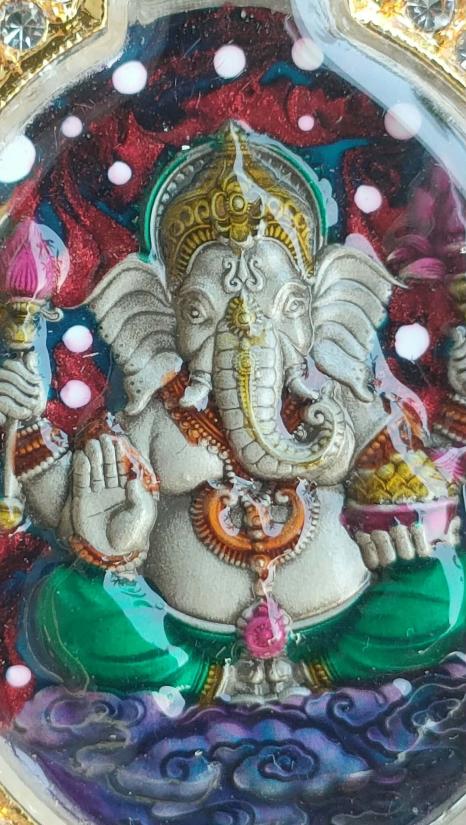 เหรียญพระพิฆเนศรุ่นพิณเณตร รวย รวย หลวงปู่ศิลา อุปถัมภ์สร้างโบสถ์มหาอุตม์ วัดบ้านโนนเดื่อ จ.ร้อยเอ็ด เนื้ออัลปาก้าซาติน ลงยาแกแล็คซี่ เลี่ยมกรอบชุบทองอิตาลี หมายเลข ๔๕ พร้อมกล่อง ผลรวมได้๙ ลงยาสวยมาก |