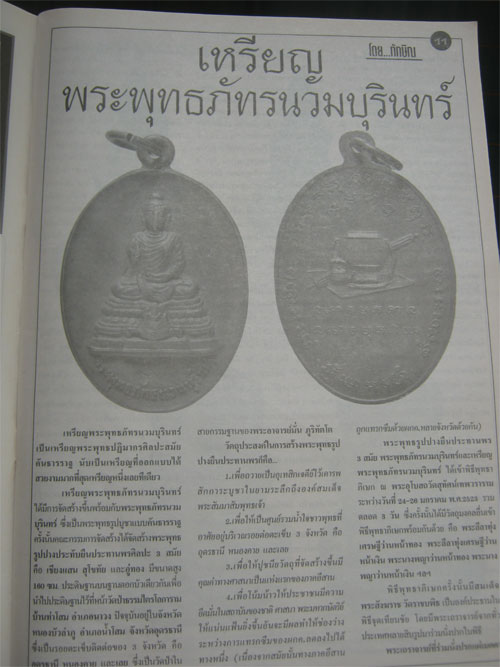 เหรียญพระพุทธภัทรนวมบุรินทร์ที่จัดสร้างในครั้งนั้น มีด้วยกัน 3 ชนิด เหรียญทองคำสร้าง 10 เหรียญ บูชาเหรียญละ 3900 ปรากฎว่ามีคนจองหมดทุกเหรียญตั้งแต่ถึงวันพิธีพุทธาพิเสก เหรียญนวโลหะสร้าง 999 เหรียญ บูชาเหรียญละ 99 บาท เหรียญทองแดงสร้าง 52,523 เหรียญ บูชาเหรียญล่ะ 99 บาท แม้เหรียญทองแดงจะสร้างจำนวนมากและราคาทำบุญในตอนนั้นค่อนข้างถูก แต่ก้อมีคนจองล่วงหน้ากันมากคนละหลายๆเหรียญ ครั้นเมื่อเสร็จพิธีก้อมีคนเช่ามากเหมือนเดิม บางคนเช่าคนเดียวก้อหลายสิบเหรียญ เพราะทราบกันดีว่าเหรียญทองแดงสร้างจากโหละศักดิ์สิทธิ์ ทั้งชนวนพระเครื่องเก่าๆหลายสิบรุ่น ตะกรุดและแผ่นยันต์จากเถราจารย์ทั่วประเทศนับเป็นพันดอกพันแผ่น ซึ่งไม่ต้องพูดพิธีและเถราจารย์ที่มาร่วมพิธี แค่ชนวนโลหะที่นำมาสร้างเหรียญก็มีคุณค่ายิ่งเป็นที่สุด