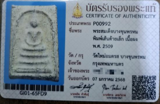 พระสมเด็จบางขุนพรหม 09 พิมพ์เส้นด้ายเล็ก พร้อมบัตรรับรองสมาคมค่ะ