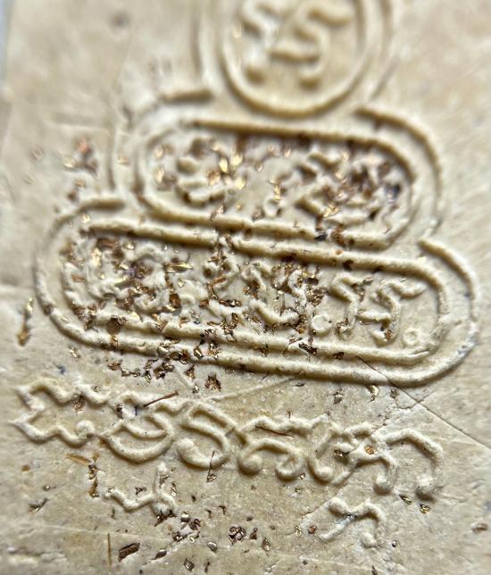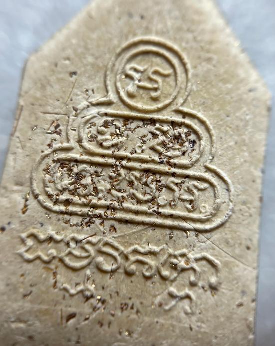 ส่วนการโรยผงตะไบทองคำด้านหลัง จะมีเฉพาะชนิดที่ปิดทองมาจากวัด แบบธรรมที่ไม่ปิดทองจะมีแต่เส้นเกศาไม่มีผงตะไบทองคำ เส้นเกศาที่ปรากฎจะมากบ้างน้อยบ้างแต่ต้องมีทุกองค์ จะมีเอกลักษณ์ประจำตัวอยู่อย่างหนึ่งไม่ว่าจะเป็นเส้นเกศาสีอะไรจะต้องแล ใสมองทะลุผ่านได้ คล้ายเส้นเอ็นที่ใช้ตกปลา ของปลอมจะแลดูทึบขุ่นๆ มองทะลุไม่ได้ องค์นี้โรยตะไบด้านหลังและเส้นผมของท่าน สภาพสวยมากๆครับ