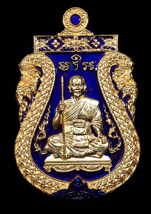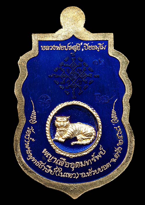 1 ใน 80 เหรียญเสมาพญาเสืออุดมทรัพย์ พระอาจารย์ประสูติ (หลวงพ่อประสูติ) วัดในเตา จ.ตรัง เนื้อบลูโรเดียมลายทอง เลขสวยต้นๆNO.12 สวยมาก