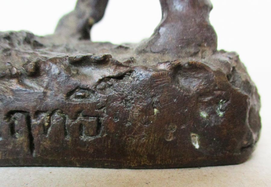ใต้ฐานอุดปูน ฝังพระวัวธนูเนื้อผงมวลสาร 2 องค์ ครั่งพุทธา 6 เม็ด และตะกรุดเงิน 2 ดอก