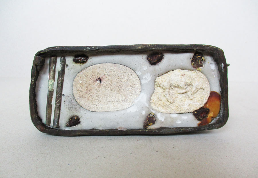 ภาพใต้ฐาน 2.2 นิ้ว X 5 นิ้ว อุดปูน ฝังพระวัวธนูเนื้อผงมวลสาร 2 องค์ ครั่งพุทธา 6 เม็ด และตะกรุดเงิน 2 ดอก