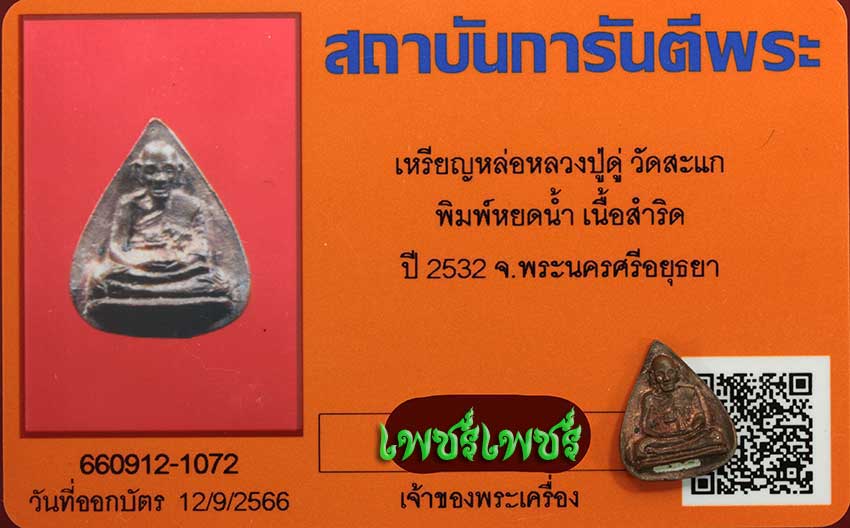 เหรียญหล่อ หลวงปู่ดู่ วัดสะแก พิมพ์หยดน้ำ เนื้อสำริด ปี2532 จ.พระนครศรีอยุธยา สภาพสวยมากคมชัด พร้อมบัตรรับรองพระแท้จากการันตีพระสบายใจได้พระแท้แน่นอน ค่ะ