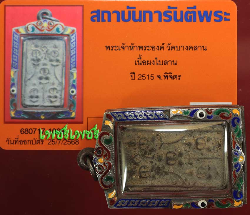 พระเจ้าห้าพระองค์ วัดบางคลาน เนื้อผงใบลาน ปี2515 จ.พิจิตร สภาพสวย พร้อมเลี่ยมพลาสติกติกกันน้ำใส่ตลับเงินลงยายกซุ้มเปอเซ็นต์สูงใบใหญ่ พร้อมบัตรรับรองพระแท้จากการันตีพระสบายใจได้พระแท้แน่นอน ค่ะ