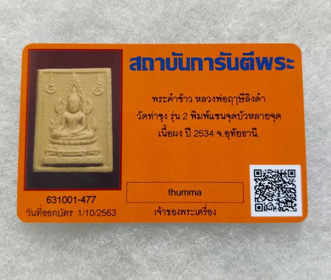พระคำข้าว หลวงพ่อฤาษีลิงดำ วัดท่าซุง รุ่น 2 พิมพ์แขนจุดบัวหลายจุด (นิยม) ปี 2534 พร้อมบัตรรับรองครับ