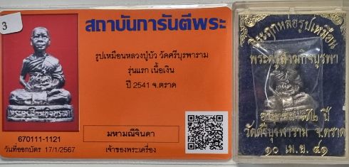 รูปหล่อรุ่นแรก หลวงปู่บัว วัดศรีบูรพาราม ปี 2541 เนื้อเงิน ตอกโค๊ต สวยมาก สร้างน้อย หายาก มีกล่องเดิม พร้อมบัตรรับรองครับ