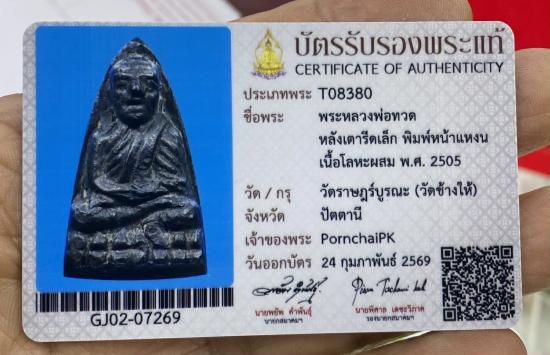 หลวงพ่อทวด วัดช้างให้ เตารีดเล็กพิมพ์พิมพ์หน้าแหงน ปี 2505 สภาพสวยแชมป์ 1 ในตองอูแน่นนอน ฟอร์มล่ำ เนื้อแดงกลับดำ ผิวเดิมๆ เข้มๆ จมูกโด่ง สุดบล็อค บัวเต็มทุกเม็ด ใหญ่ๆเด้งๆ ติดคมชัดทุกเม็ด ผิวสวย ยาดำเต็มๆ เดิมๆ ดินเบ้าตามซอกมีครบ สุดคลาสสิคแท้ ดูง่ายครับ แทบไม่ต้องลงกล้อง ช่วงแรงๆ ต้องมี สองแสน+ มาพร้อมบัตรสมาคมผู้นิยมพระเครื่องพระบูชาไทย 1 ใบ