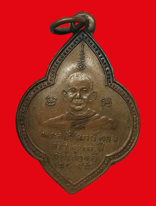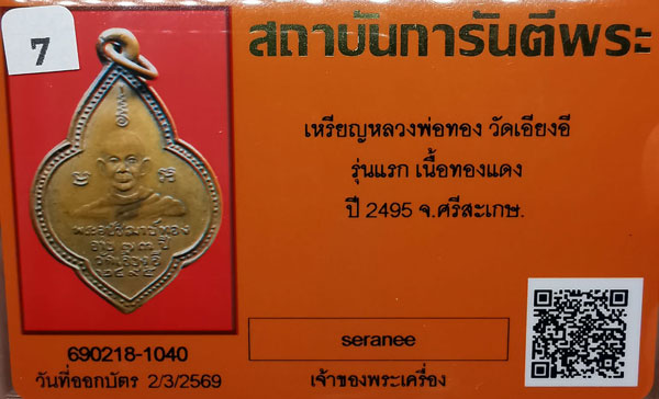 เหรียญหลวงพ่อทอง วัดเอียงอี รุ่นแรก เนื้อทองแดง ห่วงเดิม ปี2495 จ.ศรีสะเกษ + บัตรG-pra สภาพเดิมค่ะ