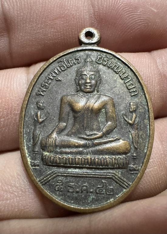 เหรียญพระพุทธไตรรัตนนายก (หลวงพ่อโต) วัดพนัญเชิง จ.อยุธยา ด้านหลังตราสัญญลักษณ์ ภปร. มหามงคล ปี 2542