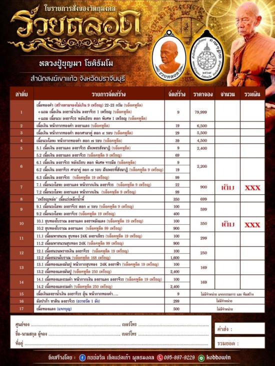 หลวงปู่บุญมา โชติธมโม สำนักสงฆ์เขาแก้วทอง จ.ปราจีนบุรี รุ่นรวยตลอด เนื้อมหาชนวนชุบทอง 24 K ราคาจอง 299