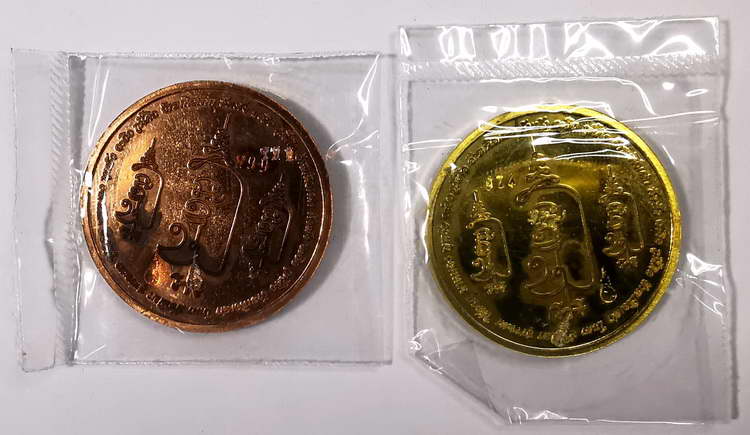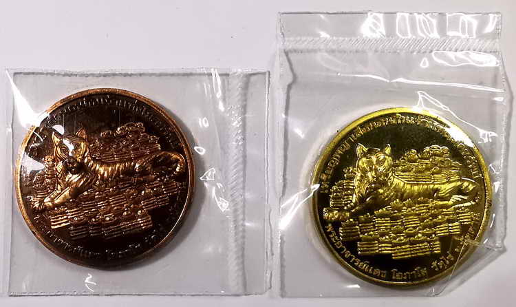 ( เคาะเดียว 2 เหรียญ เนื้อทองเหลือง + เนื้อทองแดง ) เหรียญพญาเสือนอนกิน จ้าวแห่งโภคทรัพย์ พระอาจารย์แดง วัดไร่ ปัตตานี ปี2554 เนื้อทองเหลือง + เนื้อทองแดง ตอกโค๊ตและหมายเลข พร้อมกล่องเดิมๆจากวัดครับ