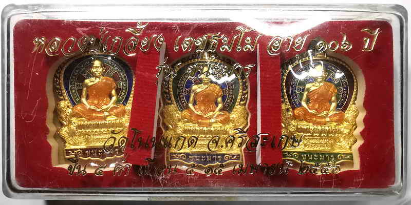 ( เคาะเดียว 1กล่อง 3องค์ ) เหรียญเสมานั่งพาน รุ่นชนะมาร หลังหนุมานเชิญธงชนะศึก เนื้อทองแดงกะหลั่ยทองลงยา ชุด 3 สี หลวงปู่เกลี้ยง วัดโนนแกด จ.ศรีสะเกษ พ.ศ.2556 สร้างเพียง 999ชุดเท่านั้น ตอกโค๊ตและหมายเลขเดียวกันทั้ง3เหรียญ