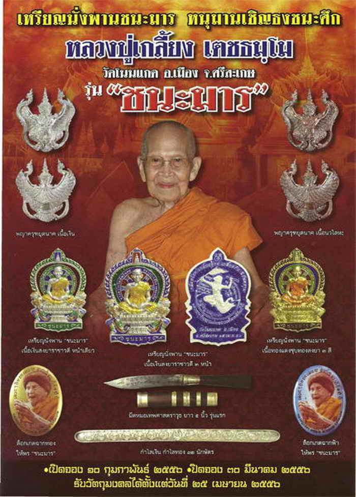 เมื่อวันที่ 15 เมษายน 2556 (ขึ้น 5 ค่ำ เดือน 5) ณ วัดโนนแกด ต.ทุ่ม อ.เมือง จ.ศรีสะเกษ ได้จัดให้มีพิธีพุทธาภิเษกวัตถุมงคลหลวงปู่เกลี้ยง เตชธัมโม รุ่นชนะมาร โดยหลวงปู่เกลี้ยงเสกเดี่ยวเป็นปฐมฤกษ์ในตอนเช้า และมีพิธีพุทธาภิเษกในตอนบ่าย โดยพระเกจิอาจารย์ที่เข้มขลังในวิทยาคม 9 รูป หลวงปู่เกลี้ยง เตชธัมโม อธิฐานจิตเดี่ยวในเวลา 06.09 น.ซึ่งถือเป็นฤกษ์ทำมาหากิน เริ่มกิจการงานค้าขาย ให้ก้าวหน้ามั่นคงเจริญรุ่งเรือง