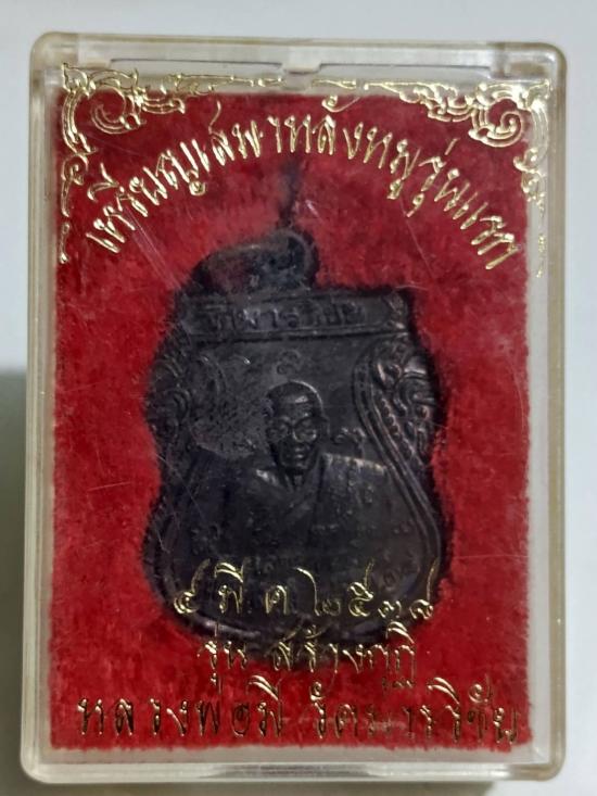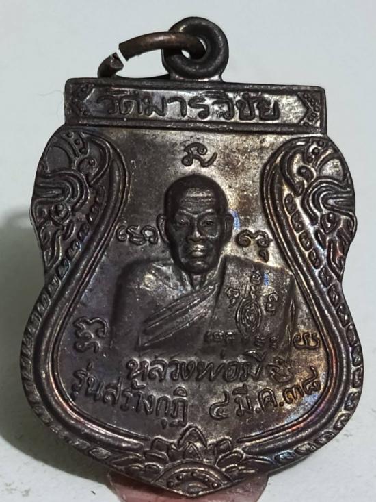 เหรียญเสมารุ่นแรก หลวงพ่อมี หลังหมู วัดมารวิชัย ตอกโค๊ตมิ เนื้อทองแดงรมดำปี38 พร้อมกล่องเดิมๆจากวัด