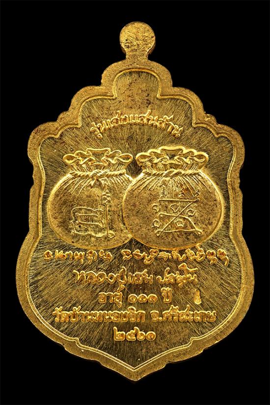 วัดใจเคาะเดียวแดง เหรียญเสมา รุ่นเฮงแสนล้าน หลวงปู่แสน วัดบ้านหนองจิก จ.ศรีสะเกษ ปี 2561 เนื้อทองทิพย์ ลงยาขอบแดงซุ้มแดง สวยๆตามภาพกล่องครบ