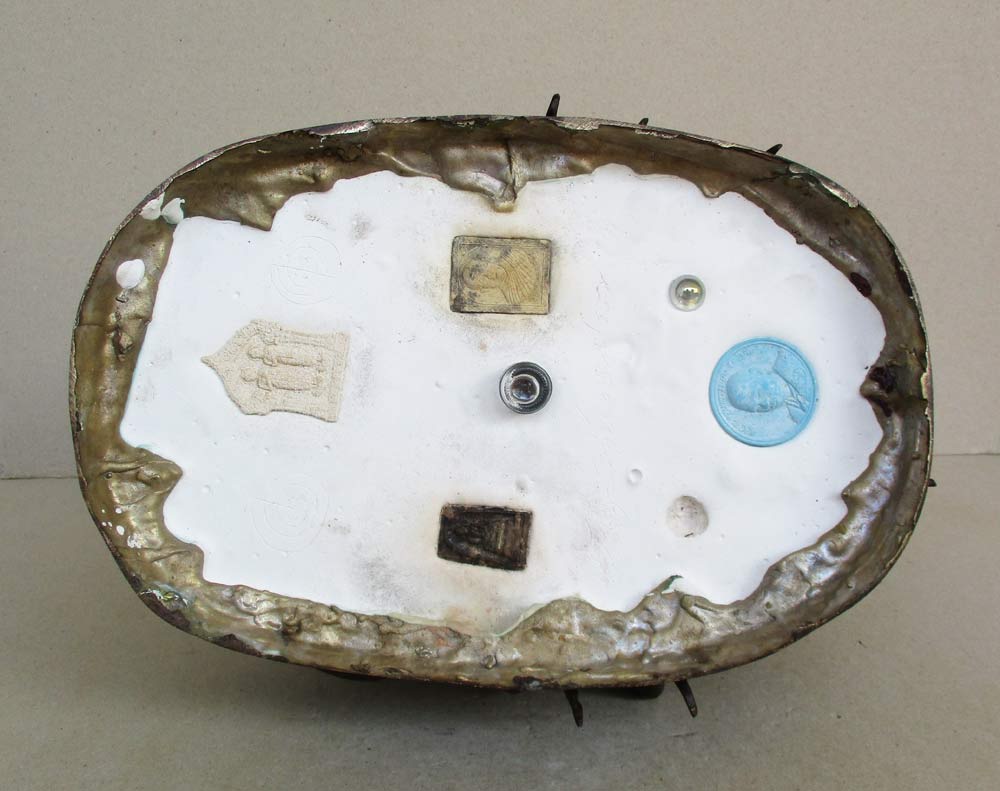 ฐานขนาด 8.7 นิ้ว X 13 นิ้ว ใต้ฐานหล่อขอบหนาๆ อุดปูน จารยันต์ที่ปูน ฝังวัตถุมงคล 6 ชิ้น หลุดหายไป 1 ชิ้น !!