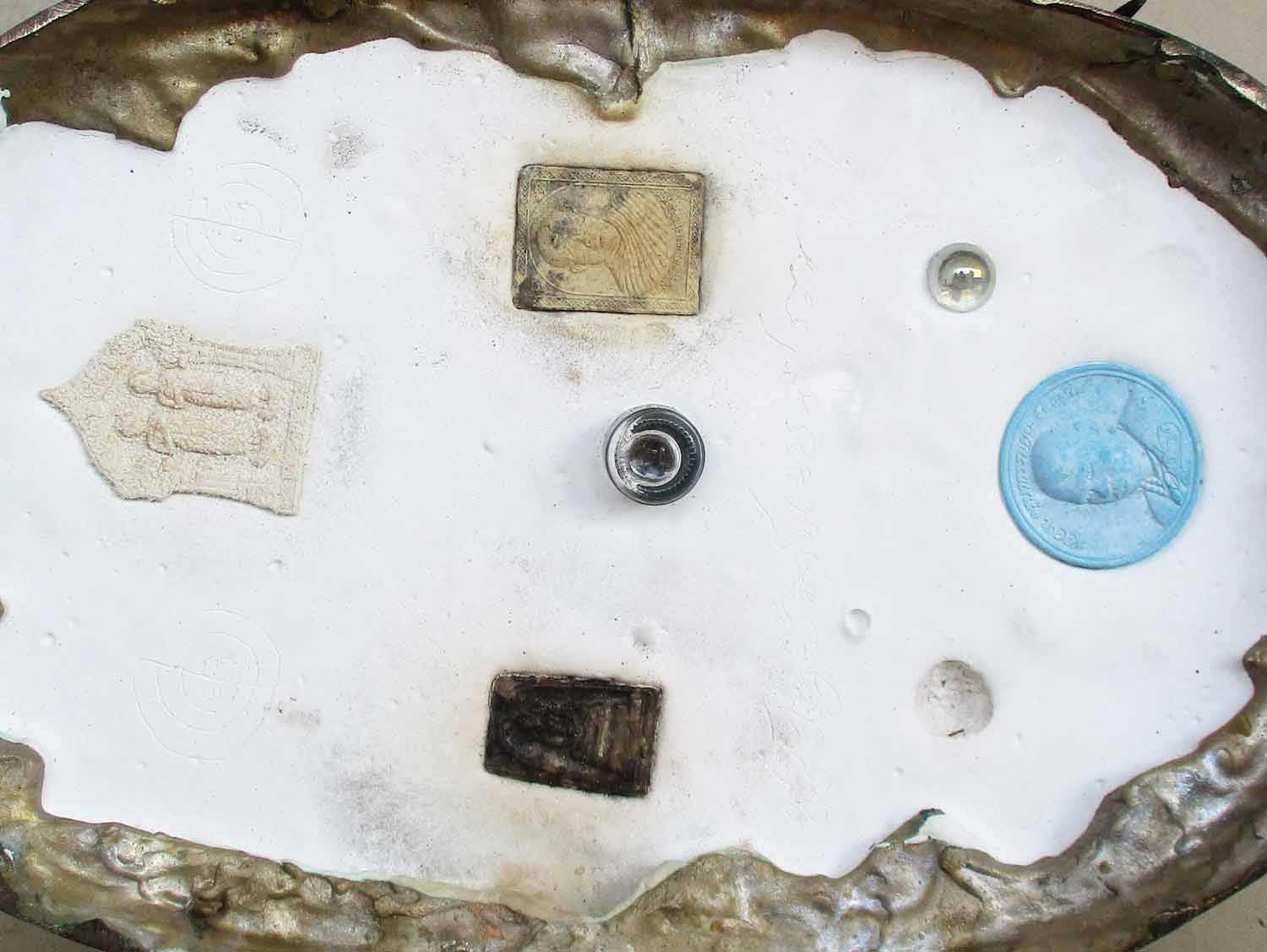 ใต้ฐานหล่อขอบหนาๆ อุดปูน จารยันต์ที่ปูน ฝังวัตถุมงคล 6 ชิ้น หลุดหายไป 1 ชิ้น !!