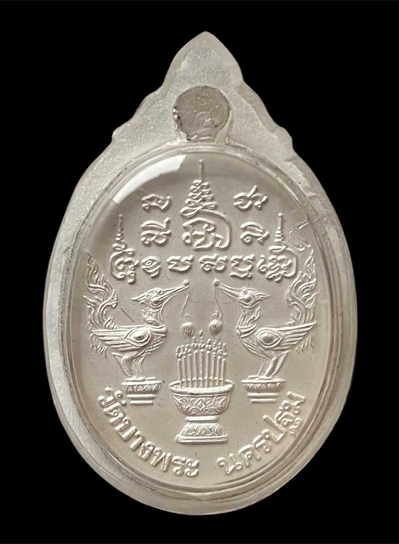 - ด้านหลังเหรียญ เป็นหงษ์คู่ข้างกระถางธูป เอกลักษณ์ แห่งศํกดิ์ศรี เมตตาและโชคลาภ ตอกโค๊ดยันต์นะชาลีติ หัวใจพระสิวลี