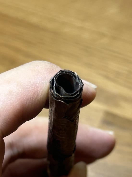 ตะกรุดทองแดงเก่า ข้างในมีรอยจาร ไม่ทราบที่