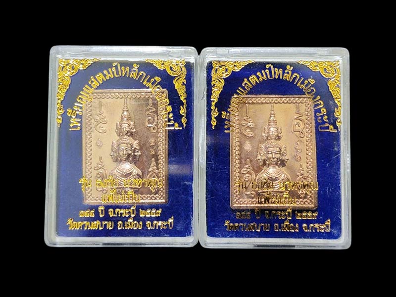 เหรียญแสตมป์ หลักเมืองกระบี่ รุ่นธงชัย นวหรคุณ ปี2559 เจ้าคุณธงชัย ปลุกเสกร่วมกับเกจิสายเขาอ้อ จำนวน 2 องค์