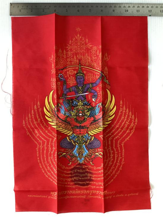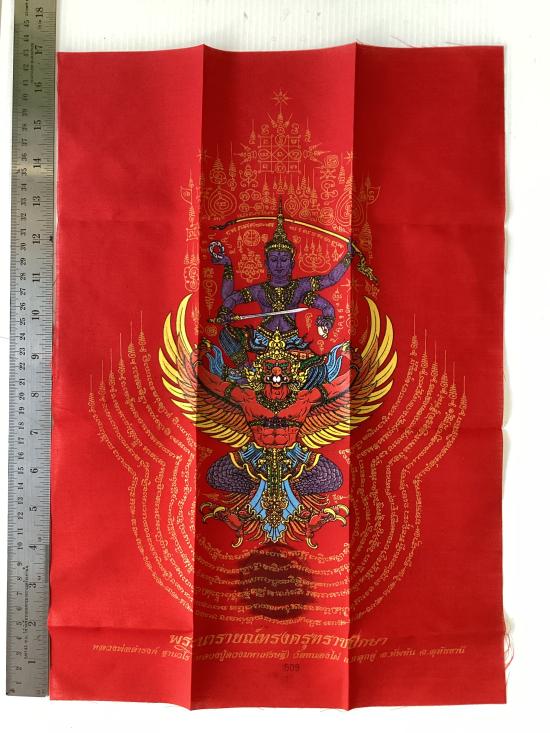 ผ้ายันต์ พระนารายณ์ทรงครุฑราชปักษา รุ่นดวงมหาเศรษฐี หลวงปู่ดวงเศรษฐี ฐานวโร วัดหนองไผ่ จ.อุทัยธานี สีแดง ขนาด A3 ( 11.5 นิ้ว x 16.5 นิ้ว)