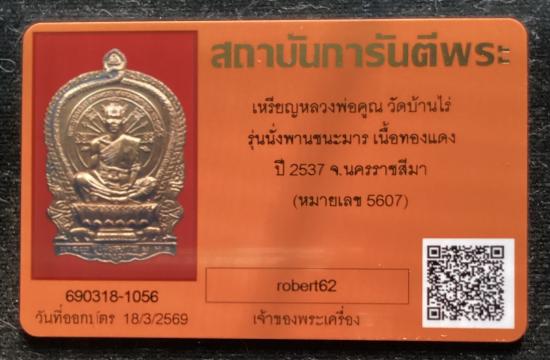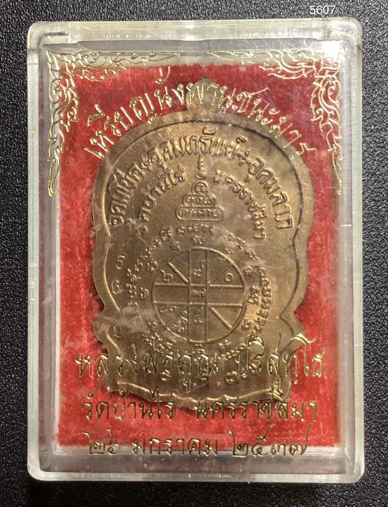 เหรียญหลวงพ่อคูณ วัดบ้านไร่ รุ่นนั่งพานชนะมาร ปี 2537 เนื้อทองแดง หมายเลข 5607 พร้อมกล่อง+บัตรรับรองครับ