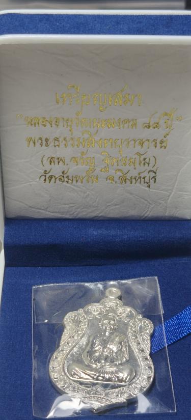 เหรียญเสมาหลวงพ่อจรัญ วัดอัมพวัน รุ่น ฉลองอายุวัฒนมงคล ๘๔ ปี เนื้อเงิน พร้อมกล่องเดิม หมายเลข จ๓๔๗๗