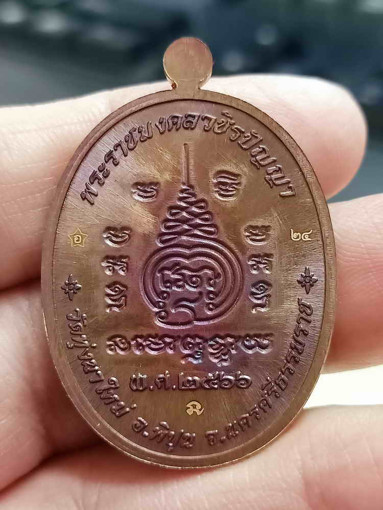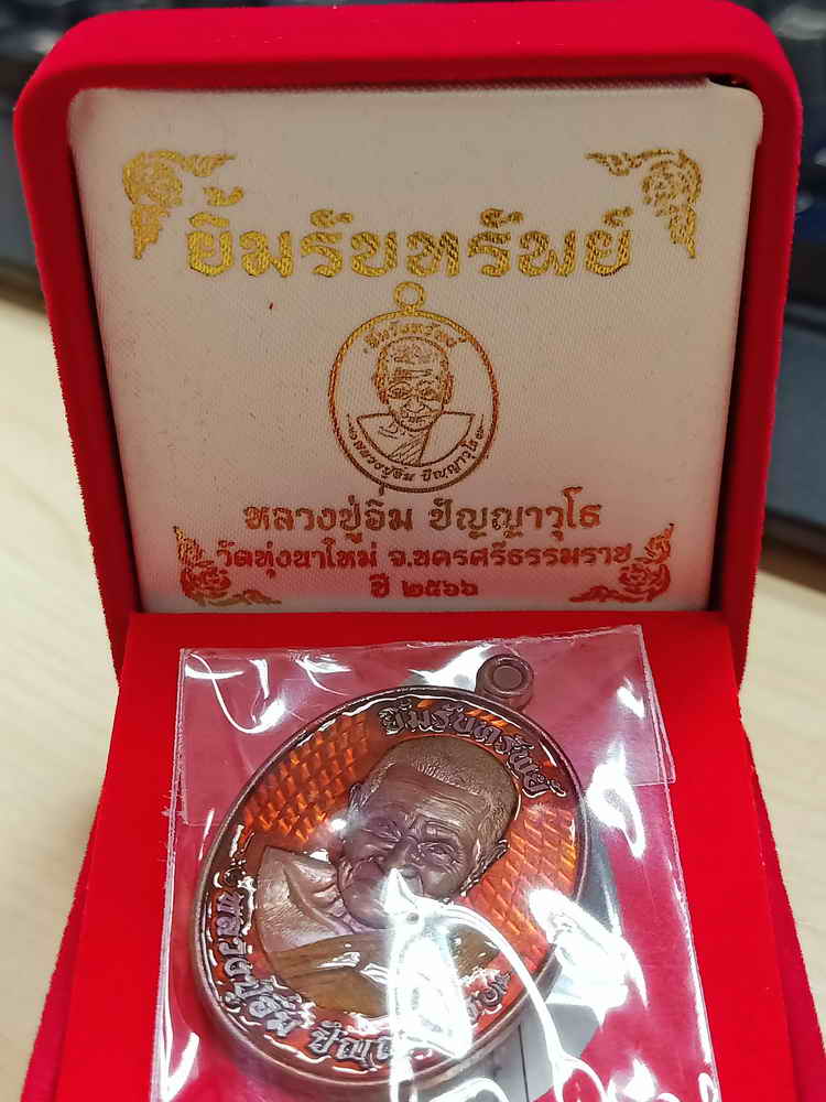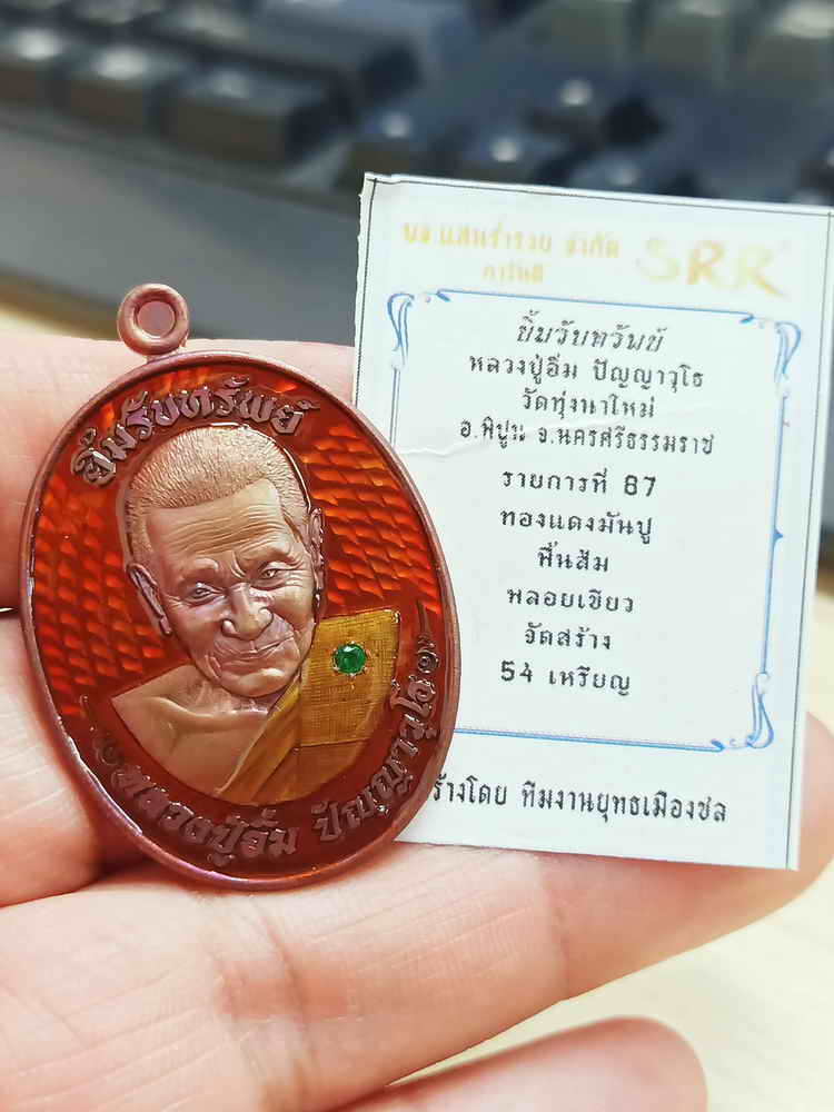 วัดใจ 100 เหรียญยิ้มรับทรัพย์ หลวงปู่อิ่ม วัดทุ่งนาใหม่ จ.นครศรีธรรมราช 2566 ทองแดงมันปู พื้นส้ม พลอยเขียว หมายเลข 24 กล่องกำมะหยี่เดิม