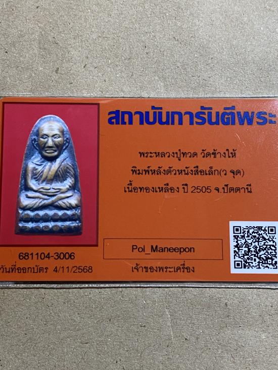หลวงปู่ทวดหลังหนังสือ เนื้อทองเหลือง พิมพ์เล็ก บล็อก ว. หน้าหนู หูกาง (นิยมที่สุด) วัดช้างให้ ปี 2505