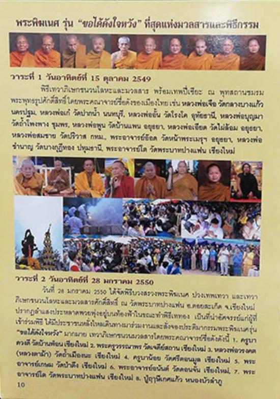 .รายนามเกจิที่ร่วมปลุกเสก 1.หลวงปู่หนุน วัดพุทธโมกข์ 2.หลวงปู่เหรียญชัย วัดถํ้าสุมณฑาถาวนา 3.เจ้าสล่าแขนดํา จ.แม่ฮอองสอน 4.เจ้าสย่าหลวง ภัททัตะ วิชัยยะ ประเทศพม่า 5.ครูบาพ่อบุญมี ประเทศพม่า 6.พระอาจารย์โต วัดพระบาทปางแฟน 7.พระอารย์เลี้ยง วัดจอมเกษ จ.อยุธยา 8.พระอาจารย์โบรี ธิระมุณี วัดสว่างโสว 9.พระอาจารย์เต๋า 10.พระอาจารย์มนต์ชัย 11.พระอาจารย์พล วัดเขาห้วยแห้ง จ.ตรัง + เหรียญชนะมาร ที่ระลึกอายุครบ 4 รอบ พระอาจารย์โต ฐิตวิริโย วัดพระบาทปางแฟน จ.เชียงใหม่