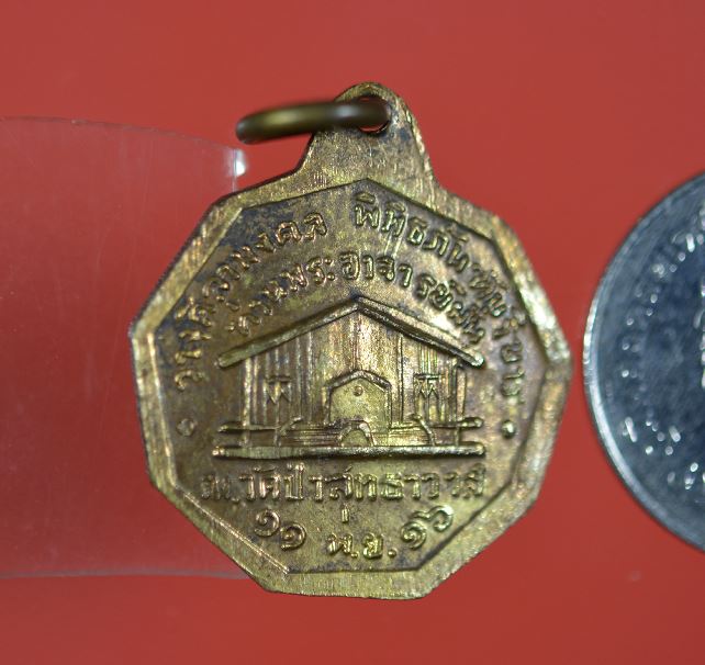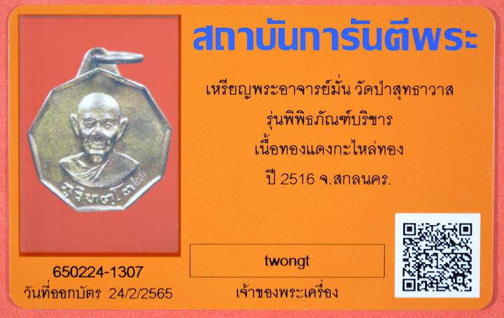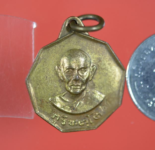 เหรียญเก้าเหลี่ยมพระอาจารย์มั่น ภูริทัตโต วัดป่าสุทธาวาส รุ่นพิพิธภัณฑ์บริขาร เนื้อทองแดงกระไหล่ทอง ปี 2516 จ.สกลนคร พร้อมบัตรรับรอง เคาะเดียวแดง