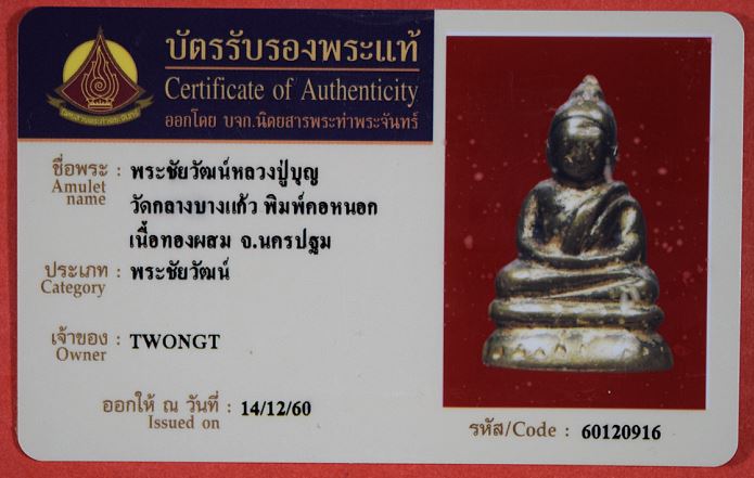 พระชัยวัฒน์หลวงปู่บุญ วัดกลางบางแก้ว พิมพ์คอหนอก เนื้อทองผสม จ.นครปฐม พร้อมบัตรรับรองจากนิตยสารพระเครื่องท่าพระจันทร์ เคาะเดียวแดง