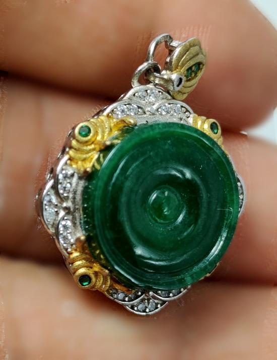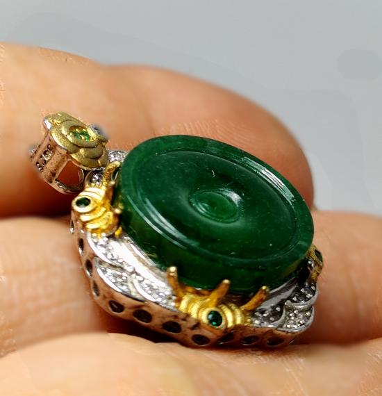 จี้หยกพม่า สีเขียวจักรพรรดิ ตัวเรือนเงินแท้925 ถมทองสองกษัตริย์ สินค้าใหม่