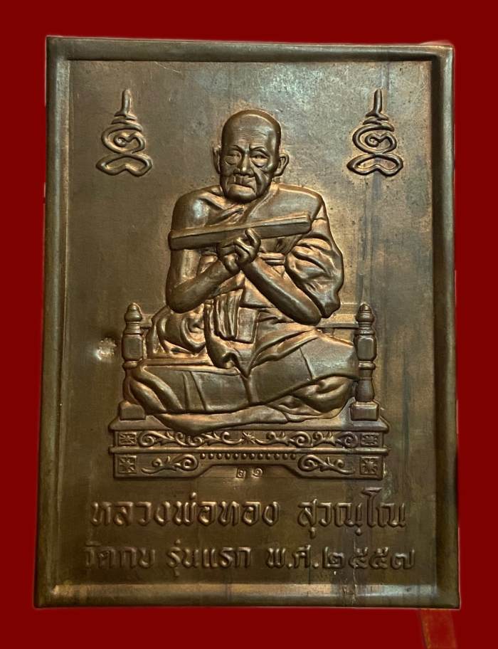 แผ่นปั๊ม รุ่นแรก หลวงพ่อทอง สุวณฺโณ วัดกบ จ.นครสวรรค์ เนื้อทองแดง ขนาด 3 * 4 นิ้ว สวย หมายเลข 21 ปี 2557