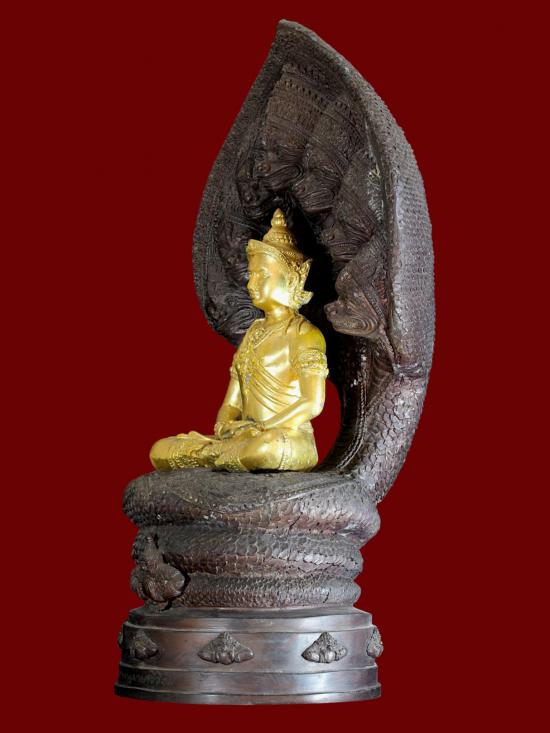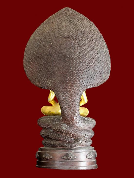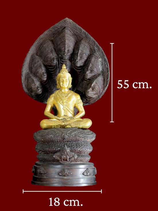 ในด้านพุทธศิลป์ องค์พระบูชาขนาดหน้าตักกว้าง ๑๘ เซนติเมตร และมีความสูงตระหง่านถึง ๕๕ เซนติเมตร สะท้อนความวิจิตรบรรจงเชิงช่างชั้นครู องค์จตุคามรามเทพได้รับการปัดทองอร่ามตา ประทับนั่งอย่างสง่างาม ตัดกับความเข้มขลังของซุ้มปรกพญานาค ๗ เศียรที่แผ่พังพานอยู่เบื้องหลัง รายละเอียดบนลวดลายฐานและเกล็ดพญานาคมีความคมชัดลึก บ่งบอกถึงความตั้งใจในการหล่อหลอมมวลสารและโลหะธาตุอันศักดิ์สิทธิ์
