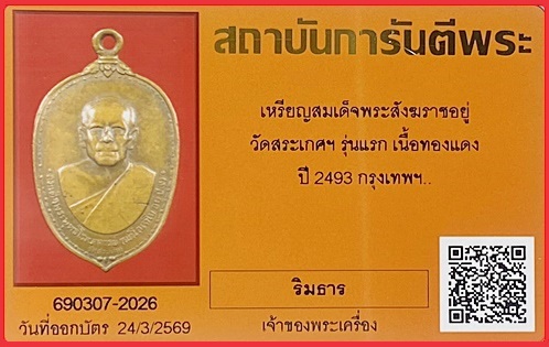 เหรียญสมเด็จพระสังฆราชอยู่ วัดสระเกศฯ รุ่นแรก ปี2493 มีบัตรรับรองจีพระ เคาะเดียว