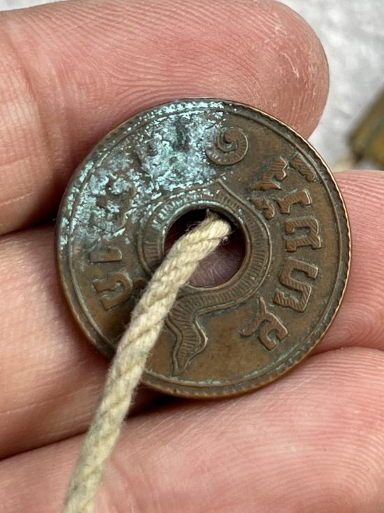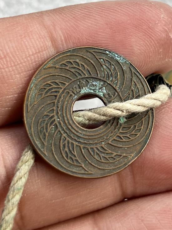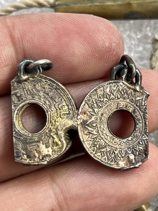 เหรียญรูแข้งสิงห์เนื้อเงิน 10สตางค์ ปี2484 (2เหรียญ) แต่พาไปทำพิธีผ่าครึ่ง เชื่อมเหรียญและเชื่อมห่วง + เหรียญรูทองแดงธรรมดาพร้อมเชือกมีตะกรุด