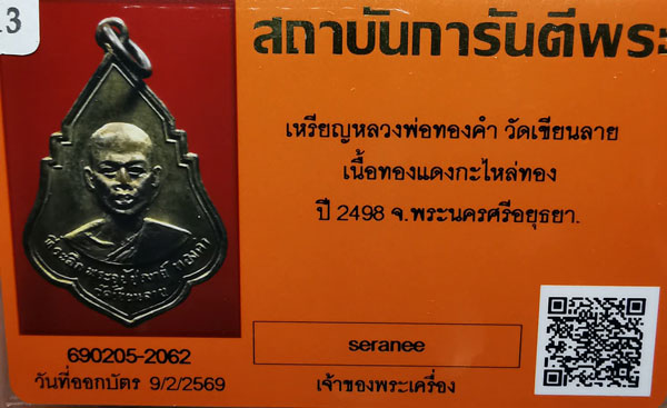เหรียญหลวงพ่อทองคำ วัดเขียนลาย เนื้อทองแดงกะไหล่ทอง ห่วงเดิม ปี2498 จ.พระนครศรีอยุธยา + บัตรG-pra สภาพสวยเดิมค่ะ