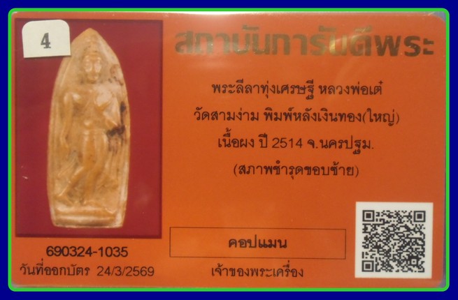 บัตรการันตี-500-พระลีลา หลังเงิน-ทอง เนื้อผงน้ำมัน พิมพ์ใหญ่ หลวงพ่อเต๋ วัดสามง่าม พศ.2514
