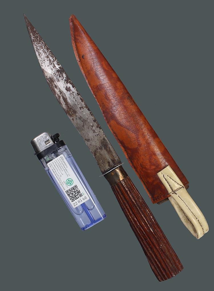 วัดใจ**เครื่องราง มีดหมอ ใบเหล็ก+อุดชันโรงเก่า ด้ามไม้+ฝักไม้ ยาว 9.5นิ้ว ไม่ทราบที่ หุ้มซองหนัง....สมบูรณ์ครับ