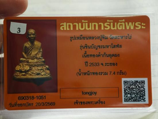 รูปเหมือนหลวงปู่ทิมรุ่นชินบัญชรมหาโสฬสเนื้อทองคำก้นอุดผง ปี 2533 น้ำหนักทองรวม 7.4 กรัมพร้อมบัตร