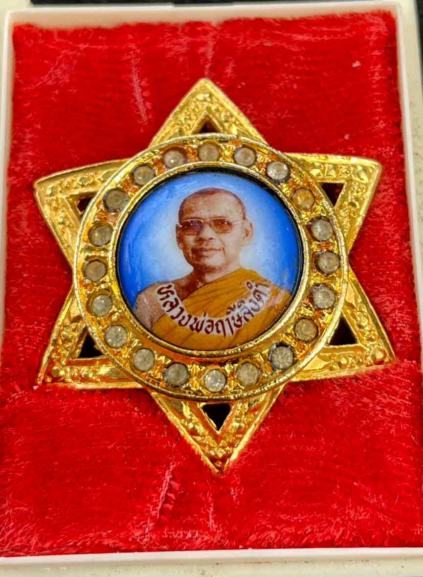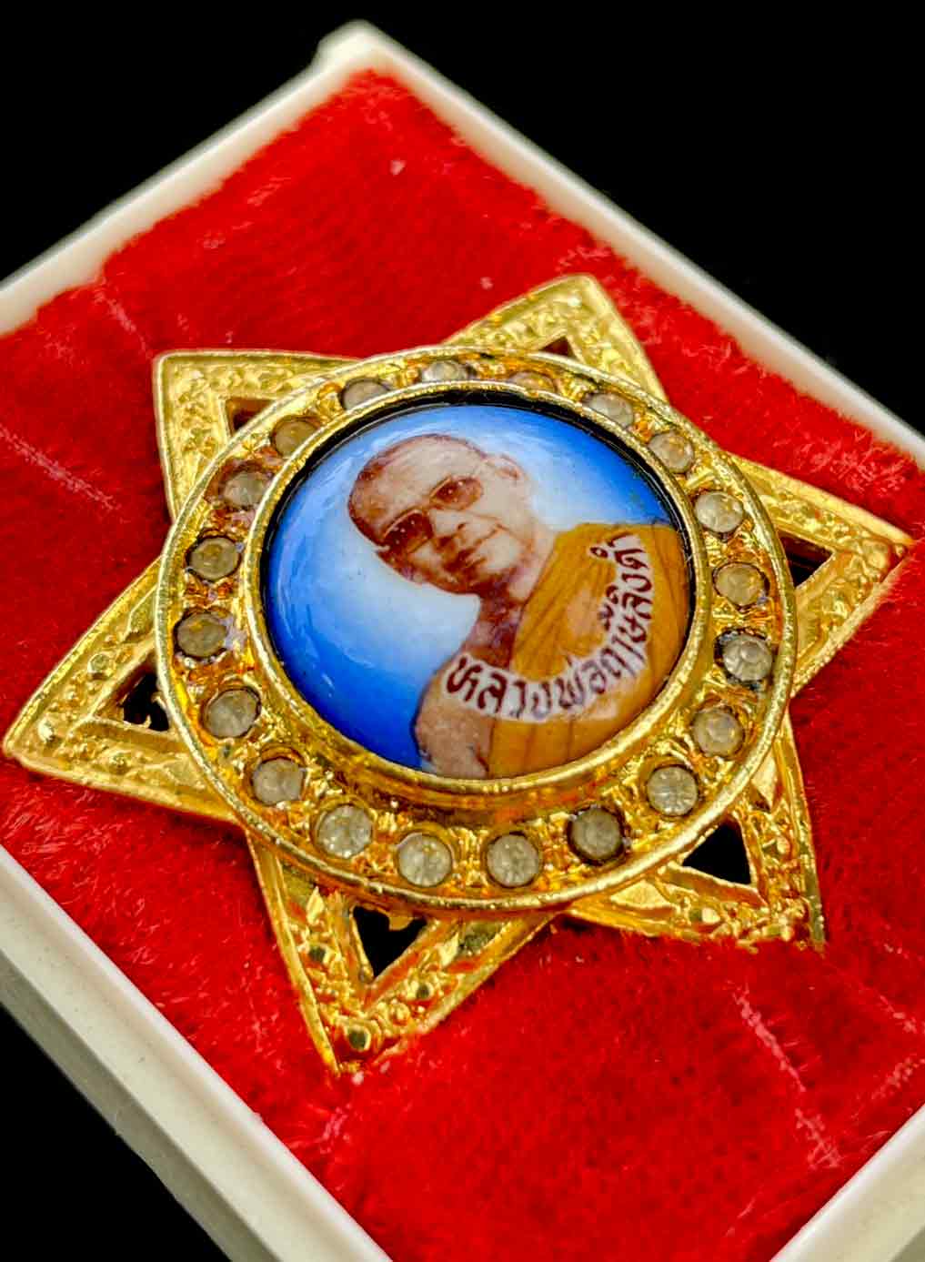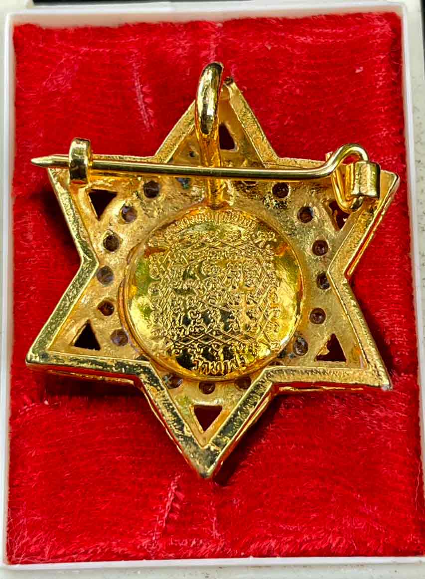 วัดใจ เข็มกลัดดาว หลังยันต์เกาะเพชร งานเป่ายันต์เกราะเพชร ครั้งที่ 5 ปี 2528 หลวงพ่อฤาษีลิงดำ วัดท่าซุง จ.อุทัยธานี กล่องเดิม
