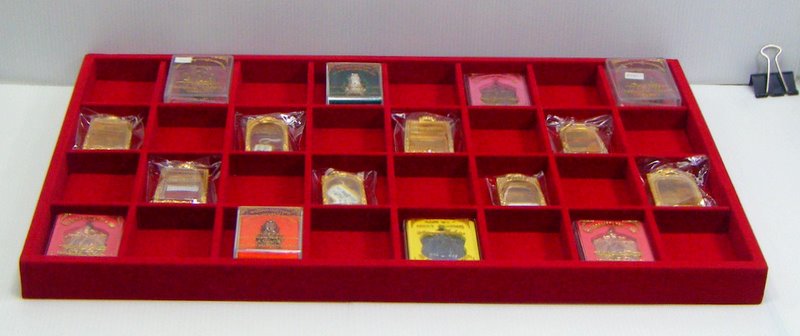 ถาดโชว์พระ แบบ32ช่อง(ใหญ่) หุ้มกำมะหยี่@สีแดง สวยหรู วางพระขนาดเหรียญ 6รอบหลวงพ่อสาคร พร้อมกล่องได้เลยคะ ชุด2ใบ มือ1ใหม่เอี่ยม พระให้ดูเป็นตัวอย่างนะคะ