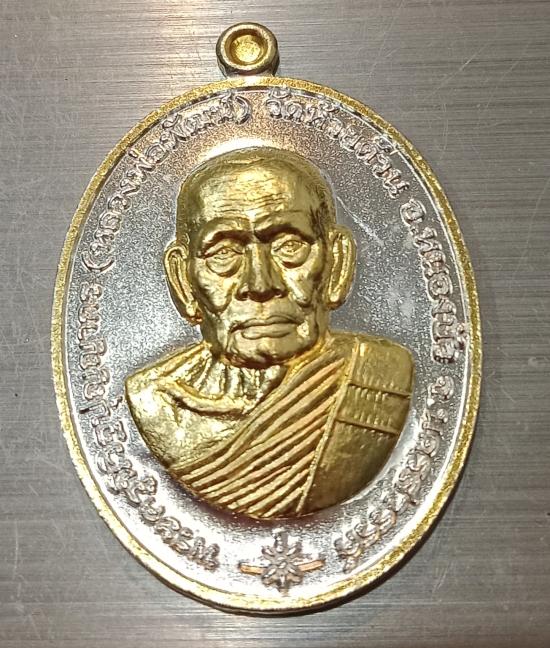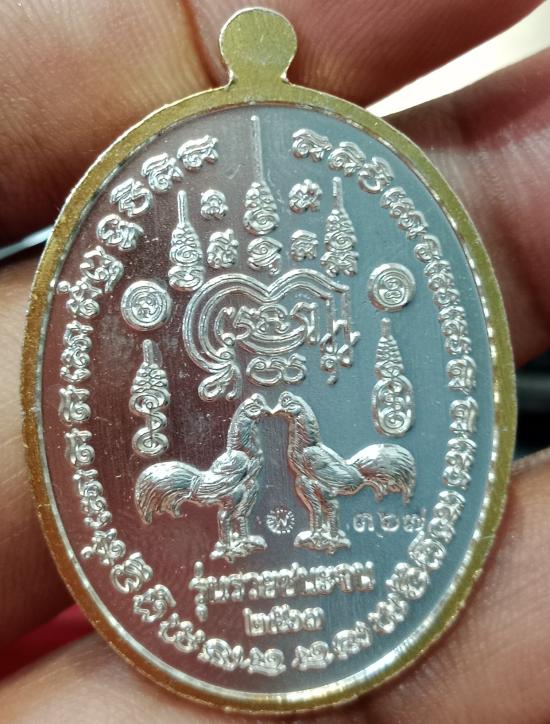 เหรียญรุ่นรวยชนะจน (ไก่คู่) หลวงพ่อพัฒน์วัดห้วยด้วน เนื้อเงินขอบชุบน้ำทอง หน้ากากทองคำแท้ 96.5เปอร์เซ็น