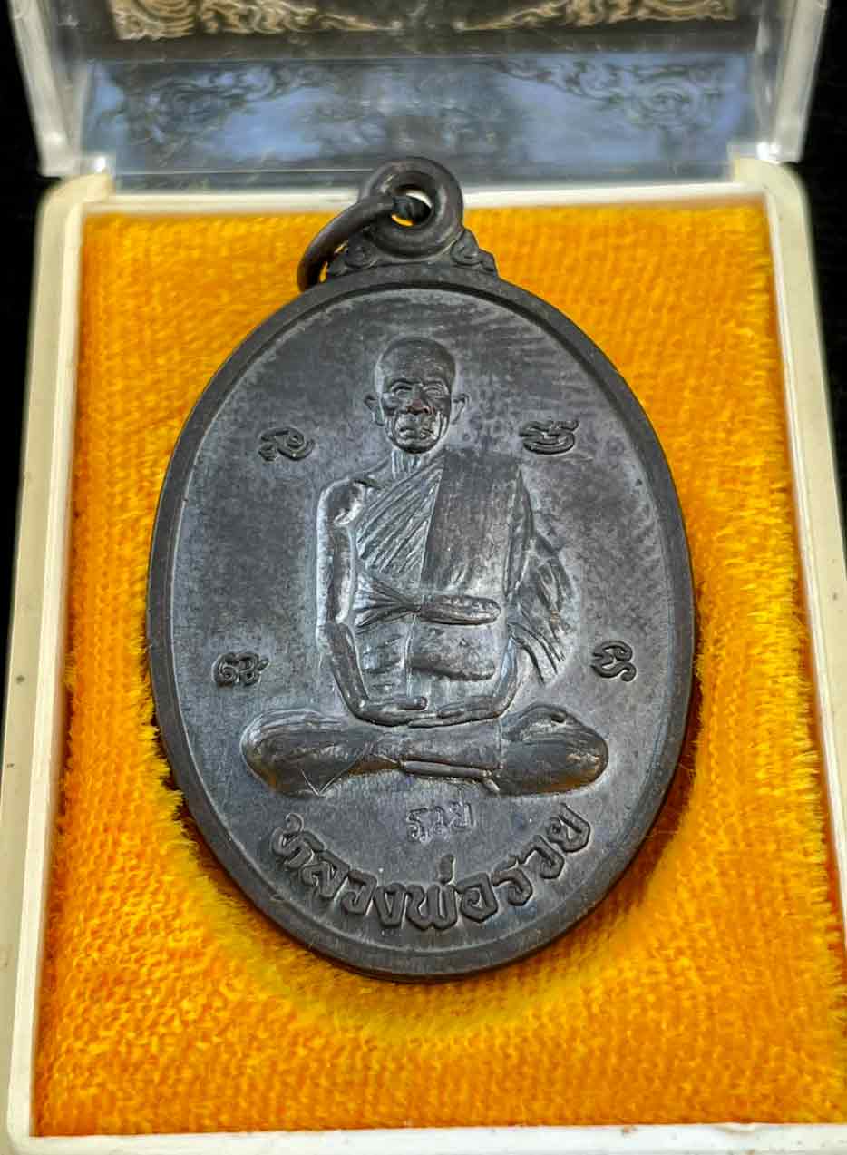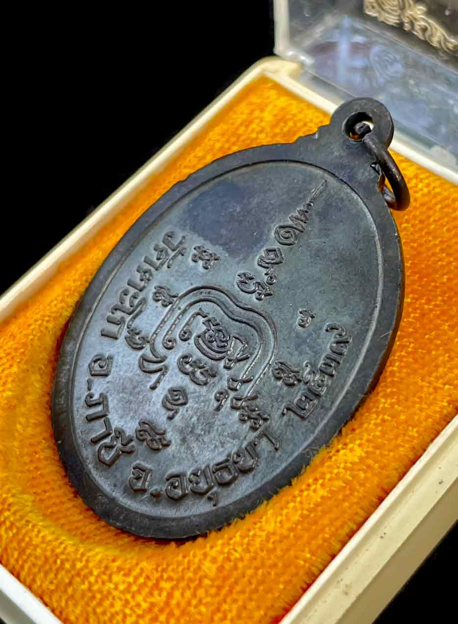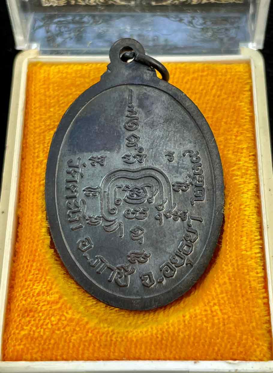 เหรียญรูปไข่ นั่งเต็มองค์ ปี 2539 หลวงพ่อรวย วัดตะโก อยุธยา เนื้อทองแดงรมดำ กล่องเดิม