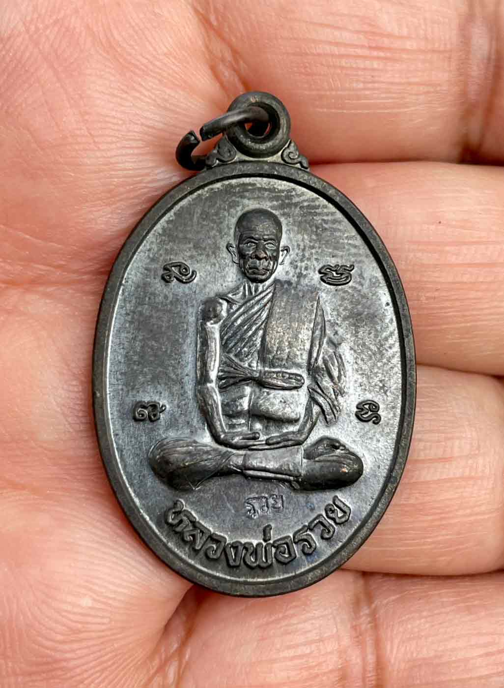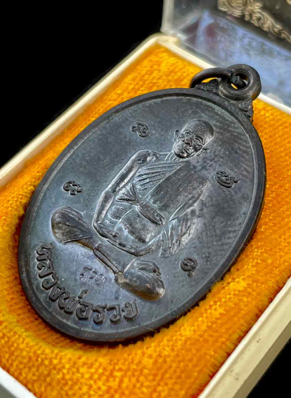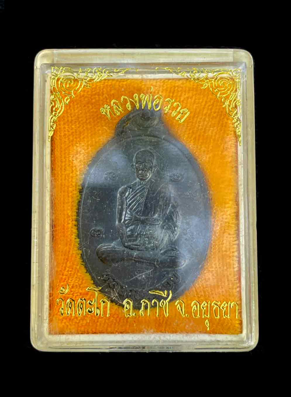 เหรียญรูปไข่ นั่งเต็มองค์ ปี 2539 หลวงพ่อรวย วัดตะโก อยุธยา เนื้อทองแดงรมดำ กล่องเดิม